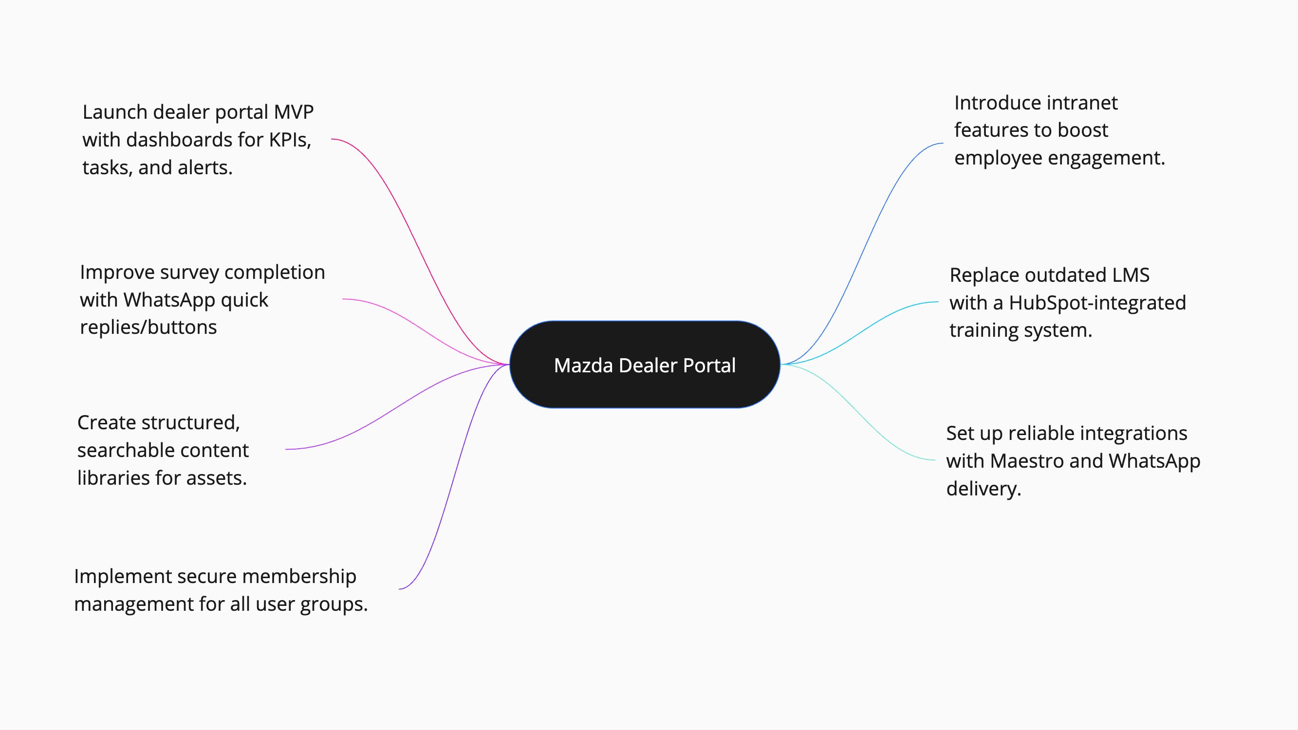Deliver a centralized, access-controlled Mazda portal that improves dealer efficiency, customer feedback visibility, and corporate communication through a seamless HubSpot-integrated experience.