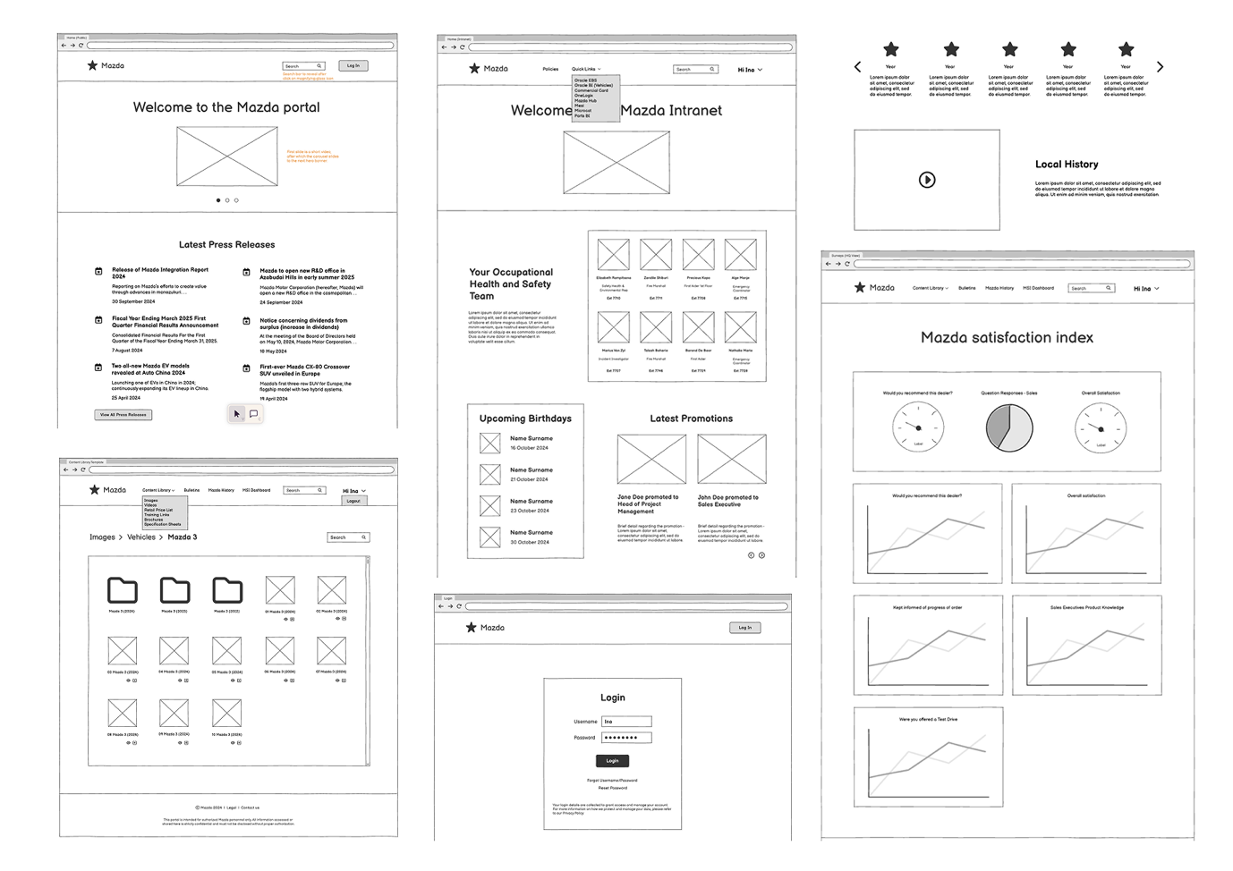 The Mazda intranet and dealer portal were designed to be both functional and engaging, highlighting key content like promotions and launches. Early Balsamiq wireframes helped balance user-focused features with practical constraints, testing layouts and content hierarchy for optimal engagement.