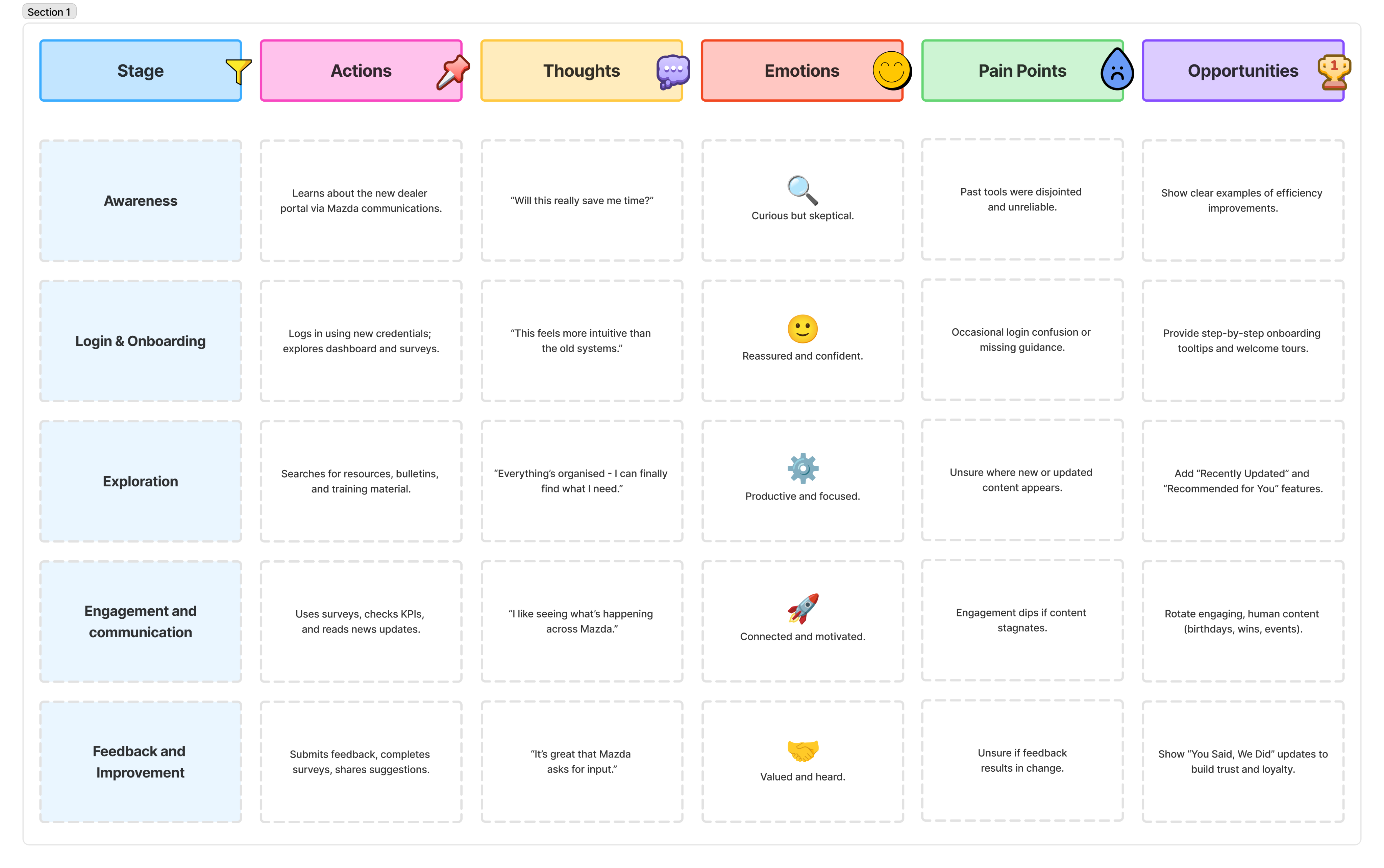 The design process for the Mazda portal has been highly iterative, shaped by multiple rounds of client feedback. Early changes focused on simplifying bulletin listings, applying standardized naming conventions, adapting article pages for press releases, and updating navigation labels. Subsequent iterations introduced clearer category structures, subcategories, and search enhancements, while survey dashboards were refined to include coloured dials, aligned naming conventions, and updated global brand-compliant colour palettes.